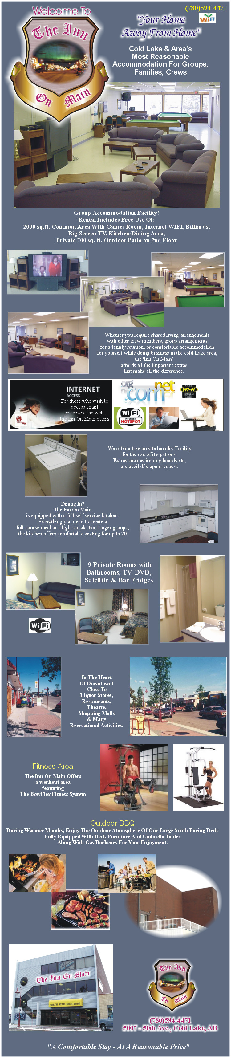 The Inn On Main After Hours Cel: (780) 812-8197 A Comfortable Stay - AT A Reasonable Price. Family Reunion Accommodtion, Crew accommodations, Cold Lake Alberta Suites, hotels, the Inn On Main, Inn on Main, Cold Lake Alberta. |
