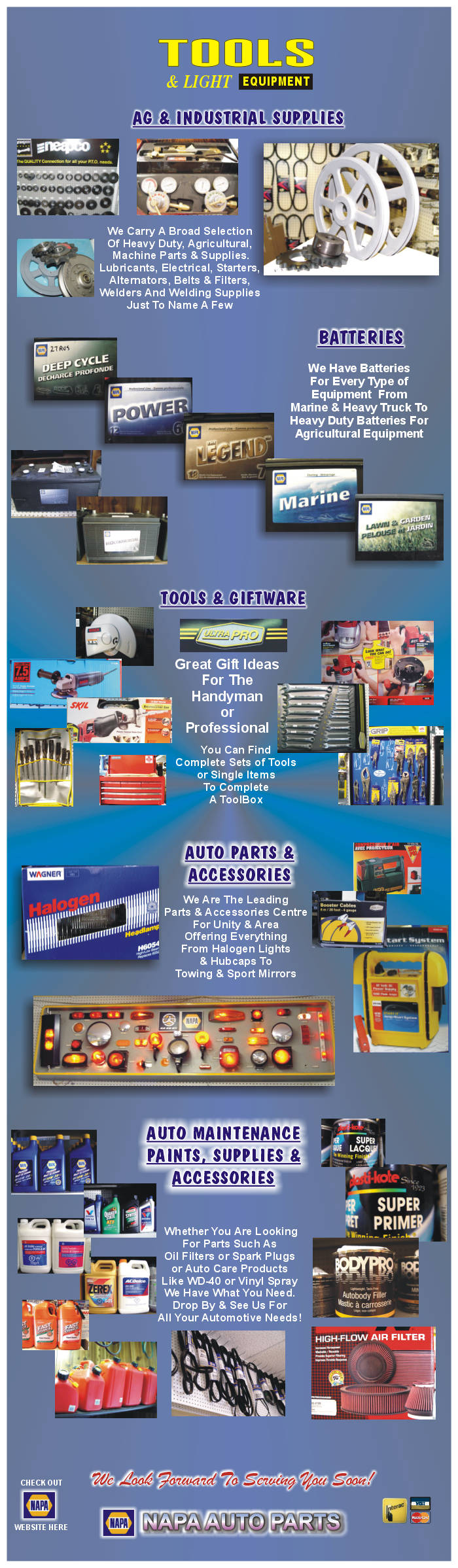 Napa Auto Parts, Cold lake, Alberta, Auto Parts, auto supplies, industrial supplies, rebuilding, cylinder head rebuilding, engine parts, brake parts, flywheel turning, liquid air, alternators, starters, starter motors, welding supplies, ag parts, truck accessories, auto accessories, industrial parts.