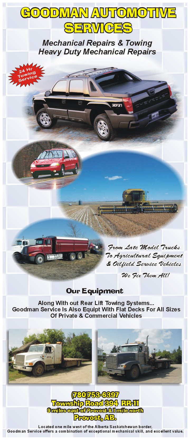 Goodman Service Provost Alberta, Alta, offers heavey duty mechanic services to the farming, oilfeild and trucking industries. hiway truck mechanics, farm machinery repairs, oilfield heavey equipment repairs, mechanical repairs, towing, towing services for Provost, Macklin, Hayter, auto repairs, truck repairs, tractor repairs, hydralics repair, serving the provost and hayter alberta, and Macklin Saskatchewan areas.